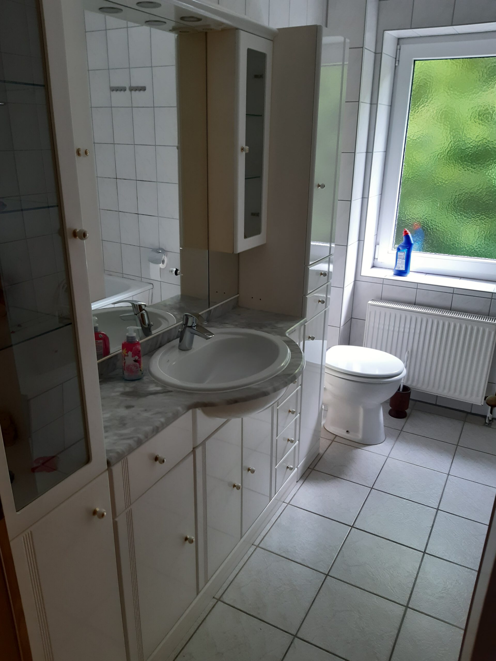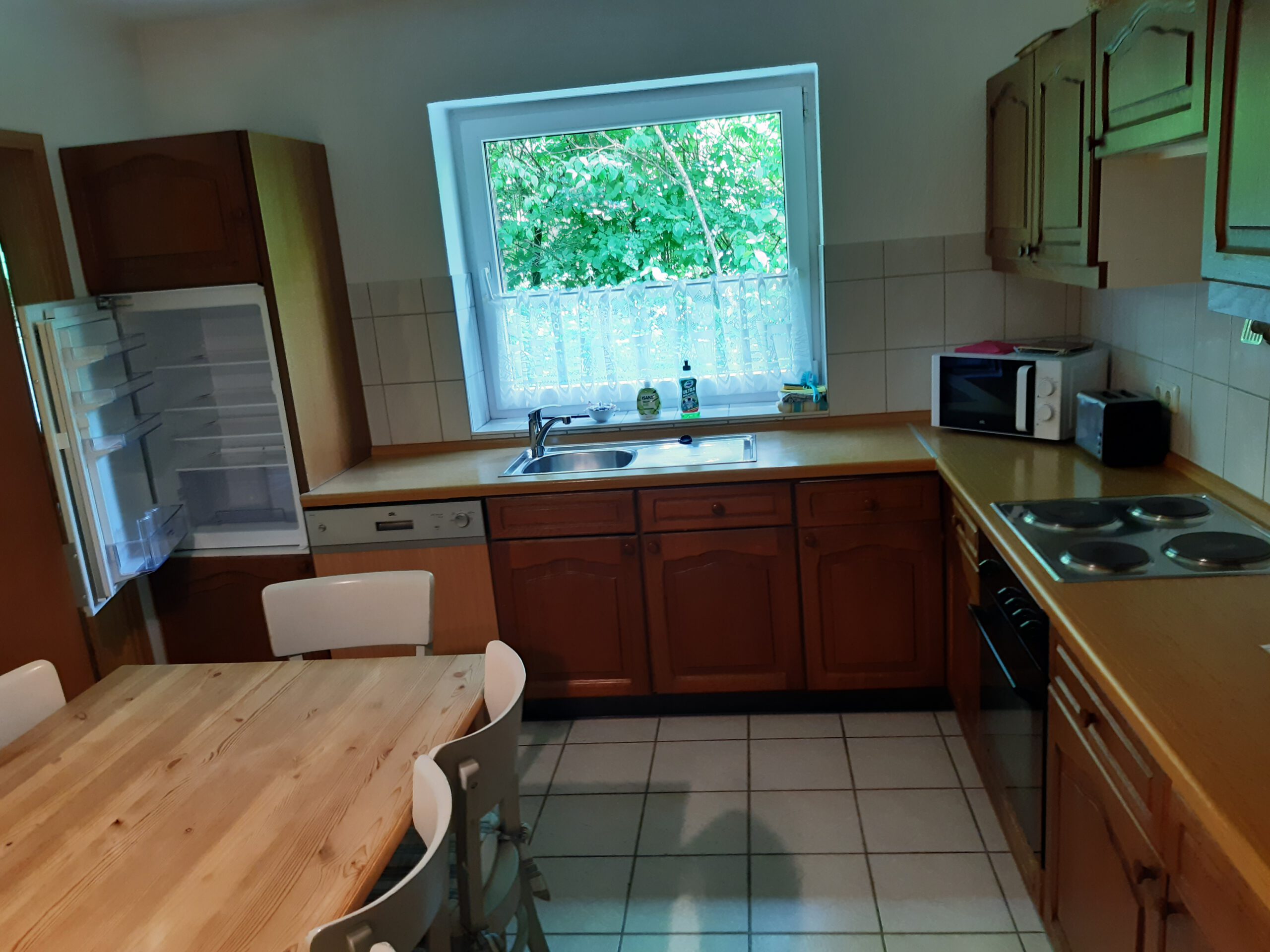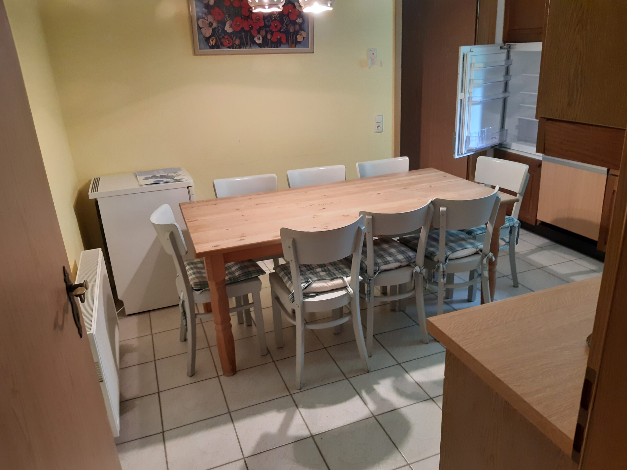 Küche: 4 Plattenherd mit Backofen, Geschirr, Kühlschrank, Spülmaschine, Mikrowelle, Kaffeemaschine, Wasser- und Eierkocher, Handmixer, Kochtöpfe, Esstisch mit 6 Stühlen